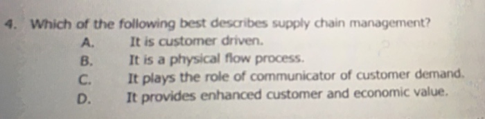 A group of collaborative companies. Application of methodologies and techniques to integrate processes of suppliers producers distributors and sellers. False Supply chain management is a set of activities and techniques firms employ to efficiently and effectively manage the flow of merchandise from the vendors to the retailers customers. Seeks to reduce the risk of anticipation. Which of the following best describes the two parts of the value chain--the supply and demand components. A the principle of improving the supply chain by focusing on the slowest step in the chain B a limitation on the number of suppliers allowed to supply a particular company C complete movement of raw materials throughout a manufacturing or service facility D a cost-reduction. Which of the following BEST describes supply chain management. Expert Answer The roots of supply chain is in 1911 when research made on how to improve manual loading process. Offering a customer immediate delivery from inventory of a small range of products and to a larger range of products is one strategy used to address.