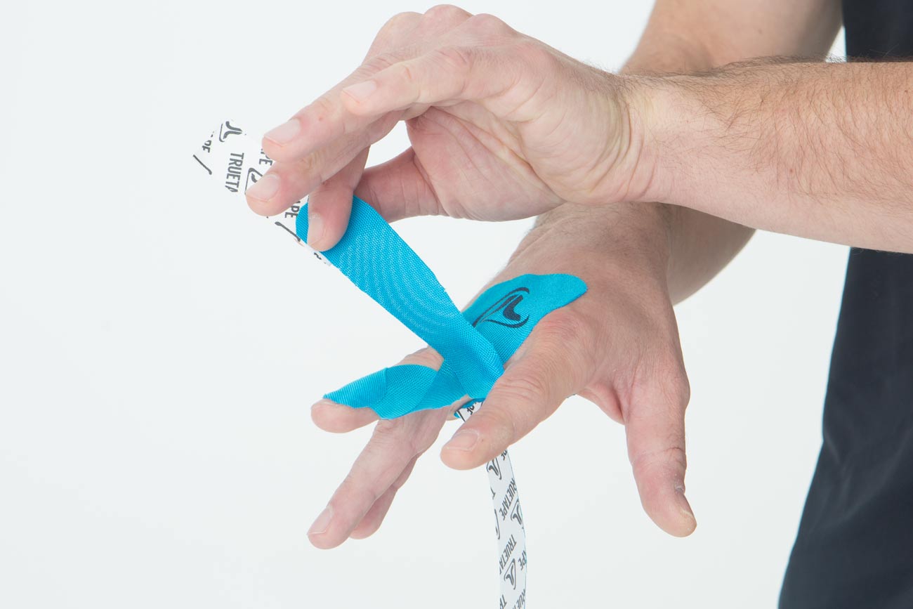 Der Daumen lässt sich aber nicht so einfach behandeln. Klebe als erstes die Basis des Tape ohne Zug auf den Hangelenkrücken.