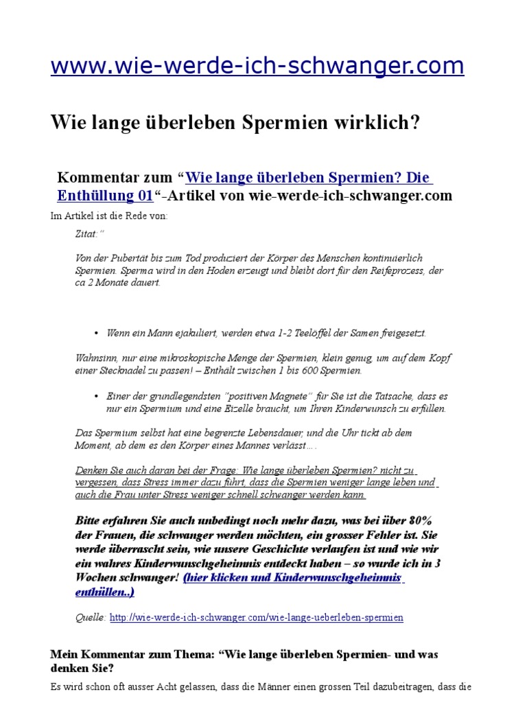 Wie lange überleben spermien an der luft. Im Körper der Frau überleben sie aber mehrere Tage. Selbst in feuchter Umgebung zum Beispiel in einer Sauna fehlen die spermienfreundlichen Bedingungen der Scheidenflora sowie die richtige Temperatur. An der Luft sind diese idealen Bedingungen nicht gegeben daher beträgt die Überlebensdauer dort nur wenige Minuten.