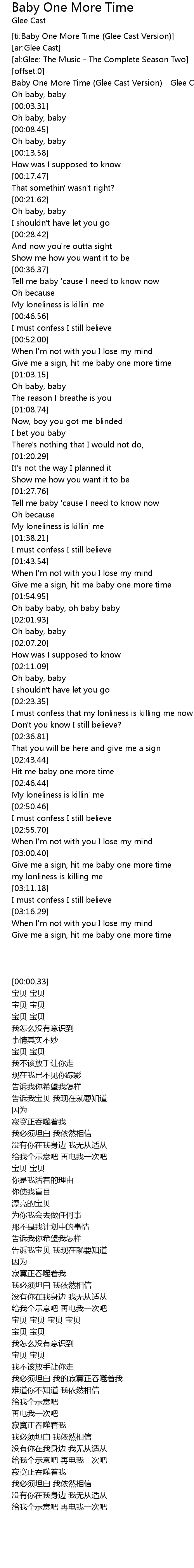 Baby One More Time lyrics by Glee Cast on Glee. Baby One More Time Glee Cast. Oh baby baby I shouldnt have let you go And now youre out.