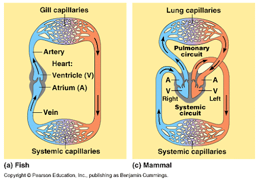 One for oxygenation of the blood through the lungs and skin and the other to take oxygen to the rest of the body. In a double circulatory system the loop that goes to the lungs is called the Pulmonary Circuit while the loop that. The blood travels from the heart to the gills where the exchange of gases takes place carbon dioxide is released and oxygen is absorbed.