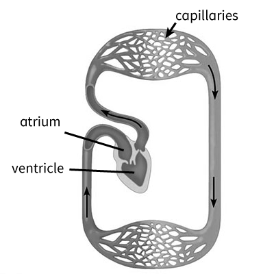In a single circuit or single-loop circulatory system it only has one atrium and one ventricle. A loop from the heart goes to the pulmonary capillary beds where gas exchange occurs.