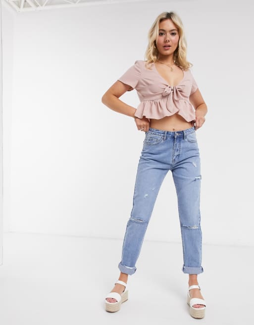 Peplum tie front top. Free Express Shipping on orders over US19900. Check out our peplum tie front top selection for the very best in unique or custom handmade pieces from our shops. Pleated woven fabric shapes this sultry plunging top with a satin-trimmed deep V-neckline and tying bow detail at front.
